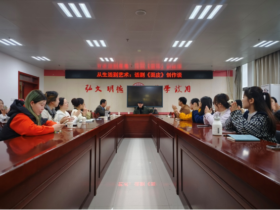 10月11下午,话剧《面皮》创作研讨交流活动在博文楼1401会议室进行,副院长赵保胜主持活动。该剧导演、主演、我集团播音与主持艺术专业首届校友汪晓龙应邀作了“从生活到艺术:话剧《面皮》创作谈”报告。汪晓龙从话剧创作背景、创作心得、舞台呈现等方面,深情讲述了这部“从泥土里长出来”的作品如何从朴素的现实生活,一步步淬炼成功人的舞台艺术。他分享了编剧如何从无数个真实的“面皮”家庭故事中提炼出典型人物与戏剧冲突,以及如何在舞台上平衡地域特色与普通情感,让地方故事引起全国观众的共鸣。汪导的讲述真诚而深刻,为师生们展开了艺术创作的神秘面纱。