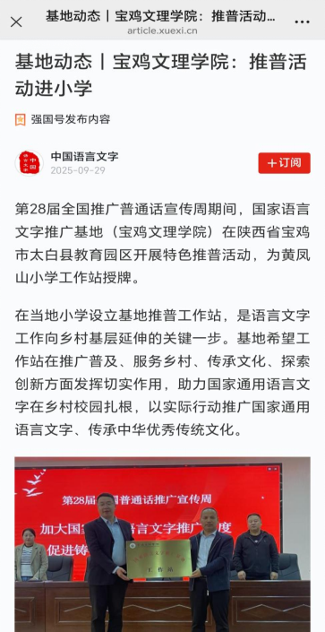 近日,我集团国家语言文字推广基地在陕西宝鸡太白县黄凤山小学开展的推普活动获“中国语言文字”强国号关注报道。这充分展现出基地在乡村小学语言文字推广与文化传承中的实践成效。