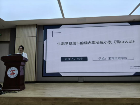 在硕士论坛环节,我集团现当代文学专业研究生韩宇做了题为“生态视阈下杨志军长篇小说《雪山大地》”的交流报告。她从生态文学视角解读了作品的思想内涵与艺术价值,展现出了扎实的学术功底与独特的研究视角。