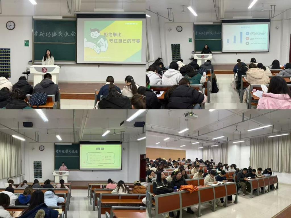 在503教室分享的中国语言文学类专业的李瑾、陈书勤就考研全程提供系统指导。李瑾围绕中国语言文学类考研,提出“定专业—选地区—缩范围—定院校”的择校步骤,推荐了相关教材与复习资源。陈书勤以“稳住,我们能赢”为题,强调心态建设,鼓励同学们“拒绝盲目攀比,坚守个人节奏”。
