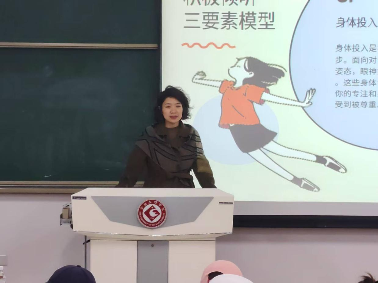 大学生心理健康教育与咨询中心主任薛茹以轻松活泼的小组游戏开启培训课程。同学们分组扮演“倾听者”与“讲述者”,围绕“近期开心的事”展开互动。游戏不仅调动了大家的积极性,也营造了良好的培训氛围。薛茹借此引出“听见”与“倾听”的区别,指出“倾听”是主动接收信息的过程,具有更强的沟通价值。在互动环节,薛茹邀请同学上台分享个人兴趣爱好,并现场演示了“糟糕对话”与“美好对话”所带来的不同沟通体验,生动展现了积极倾听的重要性。最后,她系统介绍了“积极倾听三要素模型”,包括身体投入、语言反馈和心理投入,鼓励同学们将每一次对话视为一份礼物,学会运用倾听技巧,提升沟通质量。