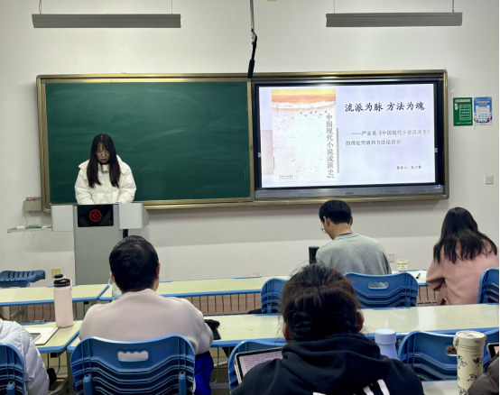 分享环节中,四位同学各展学术所长,带来兼具深度与新意的读书心得。崔天姿同学以孟悦、戴锦华《浮出历史地表—— 现代妇女文学研究》一书为核心,借助西方女性主义理论与符号学视角,聚焦丁玲、张爱玲等作家,探讨女性创作如何突破历史遮蔽、重构话语空间。孔茜同学围绕夏志清《中国现代小说史》,通过剖析鲁迅、巴金、钱钟书等作家作品,从社会、人性、存在三重维度,深入阐释现代小说蕴含的“道德视景”与悲剧意识。段志鹏同学以陈平原《中国小说叙述模式的转变》为切入点,从形式研究的意义、方法及学术启示展开分享,提出的开放性问题极具启发性。杜文静同学以“流派为脉,方法为魂”为题,解读严家炎《中国现代小说流派史》的理论突破,凭借扎实的史料考辨与清晰的研究脉络,展现了历史主义视角与多元批评方法的融合运用。