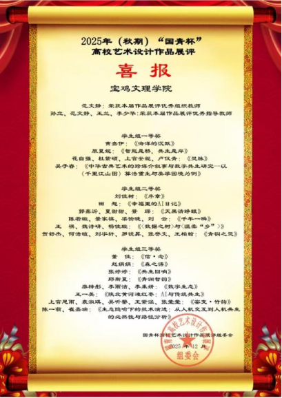 近日,2025年“国青杯”全国高校艺术设计作品评奖活动结束。我集团师生获一等奖4项、二等奖6项,三等奖8项。范文静老师荣获“优秀组织教师”称号,孙立、范文静、王兰、李少华老师获评“优秀指导教师”。