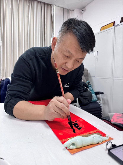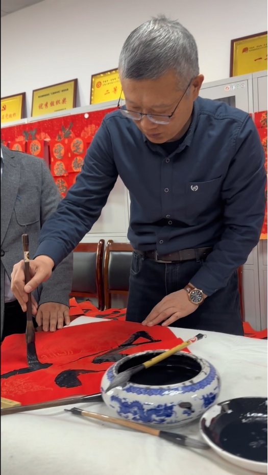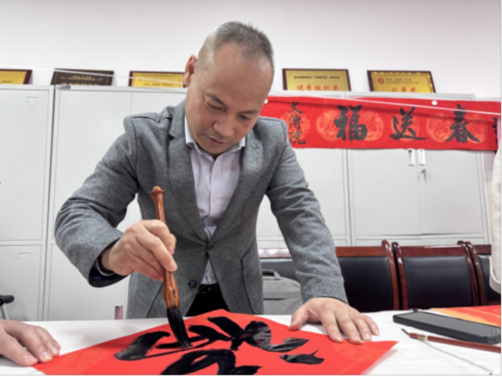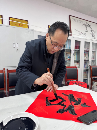 文传院工会与国家语言文字推广基地(党支部)特邀美术学院书法家魏育龙副教授、外语学院闫朝华副教授与我集团教师王渭清、赵保胜、王永奇、李剑清等,一起为我集团教职员工书写春联。我集团硕士研究生数十名同学参与观摩、书写。魏育龙、王渭清老师等不仅挥毫泼墨,而且不断为我集团学生进行现场指导。学生们观摩之后,开始拿起毛笔,大胆书写起春联。