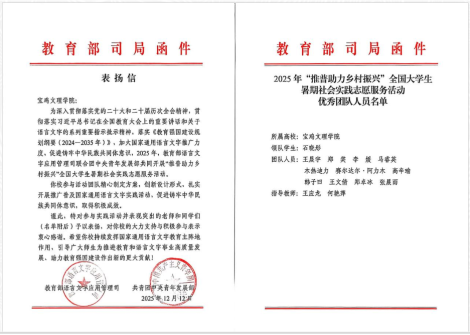 2025年,学院落实国家语言文字推广基地大思政育人建设,培育教学特色。师生赴新疆阿克苏地区温宿县柯柯牙镇帕克勒克村开展“书同文·语同音·人同心”推普助力乡村振兴社会实践志愿服务。服务少数民族地区国家通用语言文字和中华经典文化的推广普及,先后被中国新闻网、中国网、今日头条、新浪、搜狐等十余家媒体报道,影响广泛;团队入选教育部2025年“推普助力乡村振兴”全国大学生暑期社会实践志愿服务活动名单,获得全国大学生暑期社会实践志愿服务活动“优秀团队”并收到教育部、团中央来信表扬。