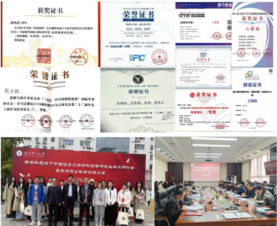 2025年,学院学科建设与研究生教育协同提质,成效显著。主办3场高水平学术会议,3位教授获聘西北大学兼职博导。研究生教育稳步推进,中国语言文学学位点顺利通过周期性合格评估;获校级研究生教学成果特等奖1项;招收硕士研究生86名,研究生发表论文35篇,获国家奖学金3项,在国家级、省级赛事获奖30余项。