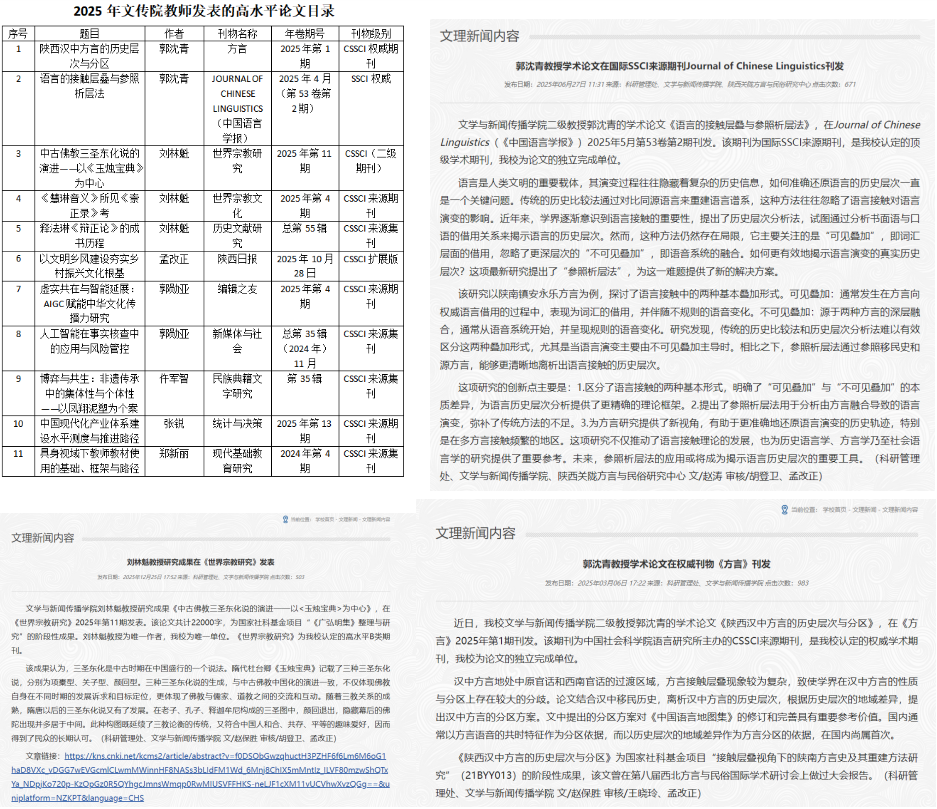 2025年学院学术研究多点突破,成果丰硕。发表 SSCI、CSSCI 等高层次论文11篇,出版专著6部,获批陕西省社科基金、教育厅重点项目等课题30余项,科研经费到账超额完成学校任务。学术交流氛围浓厚,主办“AI视域下陕西当代文学研究”等3场高端论坛,邀请国内外知名专家开展讲座25场,教师外出参会近30人次,形成“成果产出+学术交流”双向赋能的良好格局。