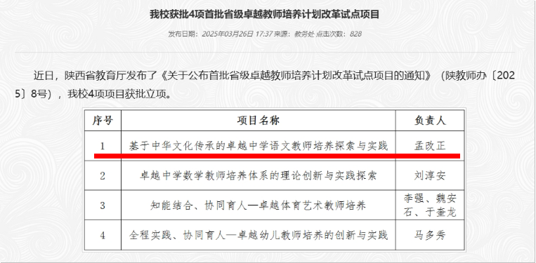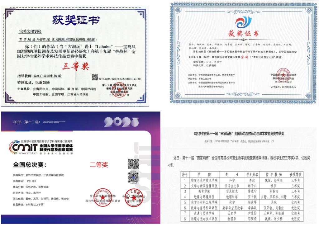 2025年《中国古代文学名作导读》获批国家一流课程,继续建设3门省级一流课程,新建2门院级智慧课程。举办了教师教学创新大赛、AI赋能教育教学能力提升工作坊等活动。2025年全院教师22人次外出培训提升,全面提升了教师教育教学能力;汇编《教改论文集》《课程思政案例集》,修订2025版教学大纲,实现课程思政全覆盖。获批陕西省首批卓越教师培养计划改革试点项目,获批校级教改项目4项、教学质量奖1人,省级重点教改项目1项通过验收,校级教学成果一等奖1项、三等奖2项。这些举措有效促进了教学从“知识传授”向“能力赋能”转型,为卓越人才培养奠定了坚实基础。