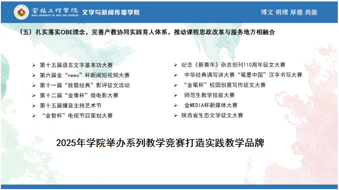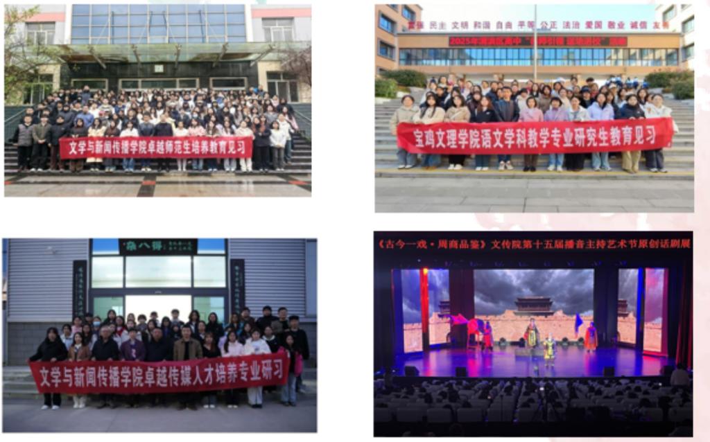 学院以人才培养为核心,全面落实OBE理念。修订2025版人才培养方案,以卓越人才培养为抓手,强化“两性一度”课堂教学改革。2025年开展“卓越传媒人才培养暨微专业建设”主题实践教学活动;举办第十五届播音主持艺术节暨《古今一戏・周商品鉴》原创话剧展演;10月至12月,开展卓越师范人才培养系列活动7场,组织师范专业师生赴宝鸡7所中学开展教育见习活动,赴渭滨中学开展“名师引领,送培进校”研修一体化活动。