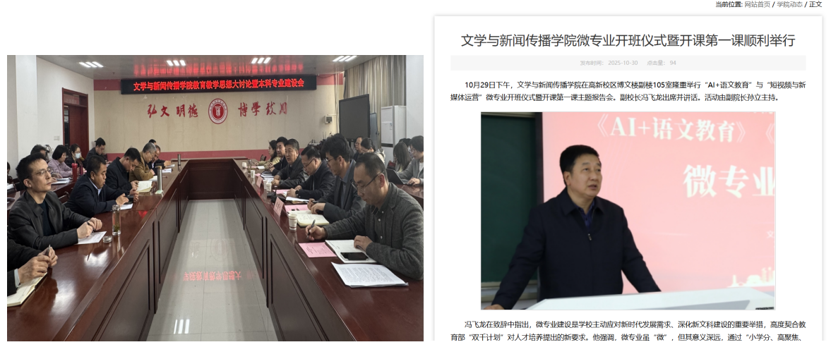 2025年,学院以新文科建设为引领,系统推进专业结构优化与人才培养模式创新。以本科教育教学审核评估整改契机,学院停招广告学专业,开设“AI+语文教育”“短视频与新媒体运营”两个微专业,推动跨学科融合培养。学院成功入选教育部“专业大模型(数字文创)赋能AI+应用型大学建设”项目院校,这是我集团继教育部中外人文交流全媒体基地之后获批的又一教育部平台,为学科专业数字化转型升级提供了高水平平台支撑。