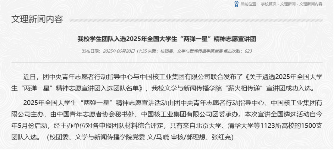 2025年,学院培育组建“薪火相传递”大学生理论宣讲团,赴西安、咸阳、宝鸡等地常态化开展弘扬科学家精神、传承红色基因等主题宣讲活动10余场,深化思政浸润,推动红色基因融入青春血脉,覆盖师生及社会群体2000余人次,并成功入选全国大学生“两弹一星”精神志愿宣讲团。