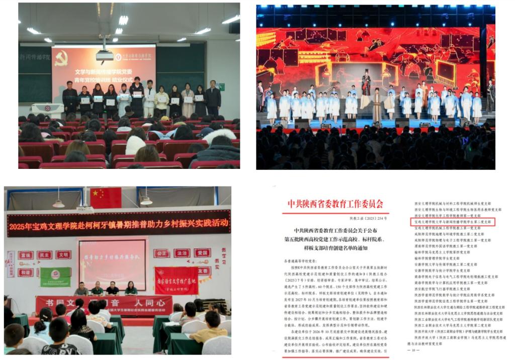 一年来,党的建设和思想政治工作持续加强。认真做好党建双创省级样板支部和校级标杆院系建设工作;成立二级学院首家青年党校,创新党员日常教育路径;结合学科特色打造廉政文化节目、推普助力乡村振兴、“两弹一星”精神宣讲等党建品牌;与宝鸡市高新十小常态化开展联建共建活动,不断深化党建与业务融合新路径。学生第二党支部获评第五批陕西高校党建工作样板支部培育创建单位,国家语言文字推广基地党支部样板支部申报材料已经省委教育工委推荐报送至教育部。