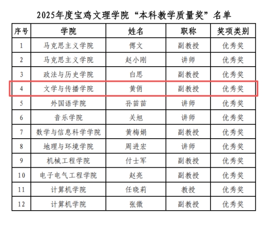 3.2026年1月15日,学校公布了“关于公布2025年‘本科教学质量奖’评选结果的通知”,我集团教师黄俏副教授荣获2025年度ok138太阳集团“本科教学质量奖”优秀奖。